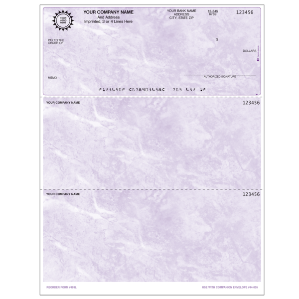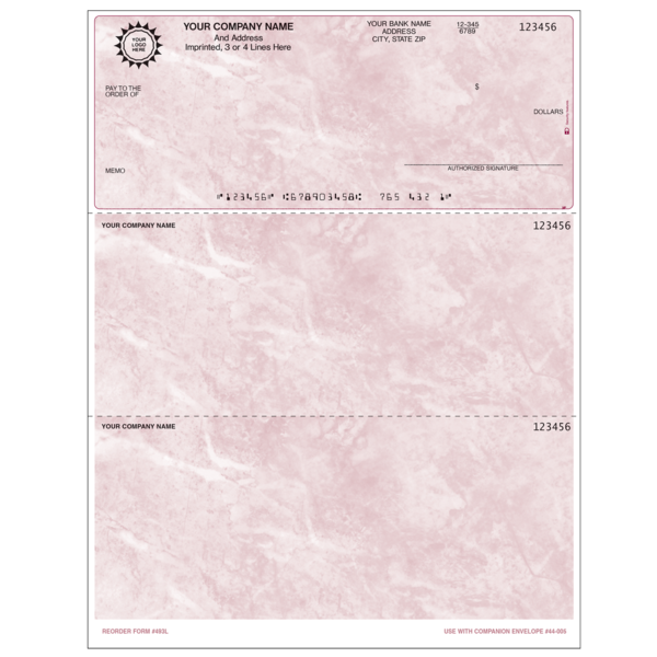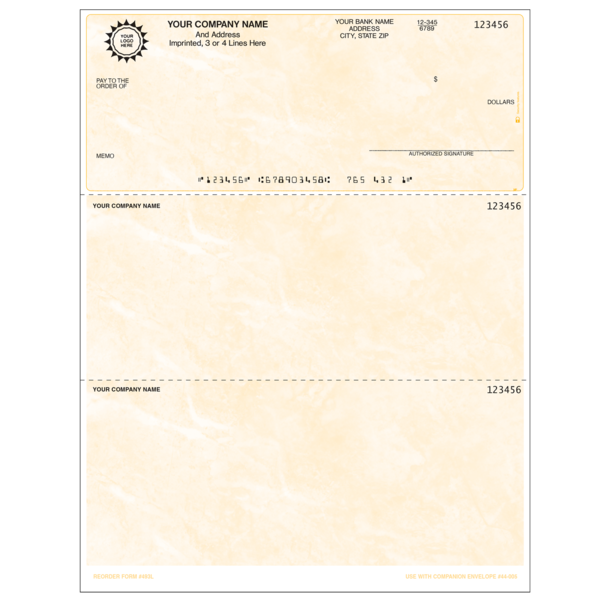 493L Top Check SKU: 493L $2.80 Select options Back $2.80 REPEAT, NEW, OR REPEAT WITH CHANGES ? : Repeat New Repeat With Changes Prior Job# Reverse Numbering : No Yes Check Start Number Number of Signature Lines : NONE 1 2 3 Special Instructions COLOR: Company Information Line 1 Company Information Line 2 Company Information Line 3 Company Information Line 4 Company Information Line 5 City State Zip Phone Fax Email Bank Name Bank Address Bank Address 2 Routing Number Account Number Imprint Below Signature Line Title Above Signature Line Text on Check Stub SELECT LOGO COLOR : Black Reflex Blue Process Blue Teal (PMS 320) Green (PMS 348) Green (PMS 347) Brown (PMS 464) Maroon (PMS 201) Burgundy (PMS 208) Warm Red Red (PMS 185) Orange (PMS 151) Gray (PMS 423) Custom Color Logo Option : $0 - Color Logo $68 - Black Logo $90 - Color Logo No Charge - 1 Color Logo No Charge - Black Logo EZ-Shield : No Yes Quantity -+ Please select options before adding to cart Add to Cart Add to Cart